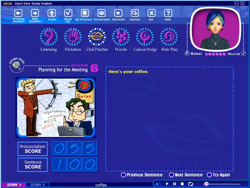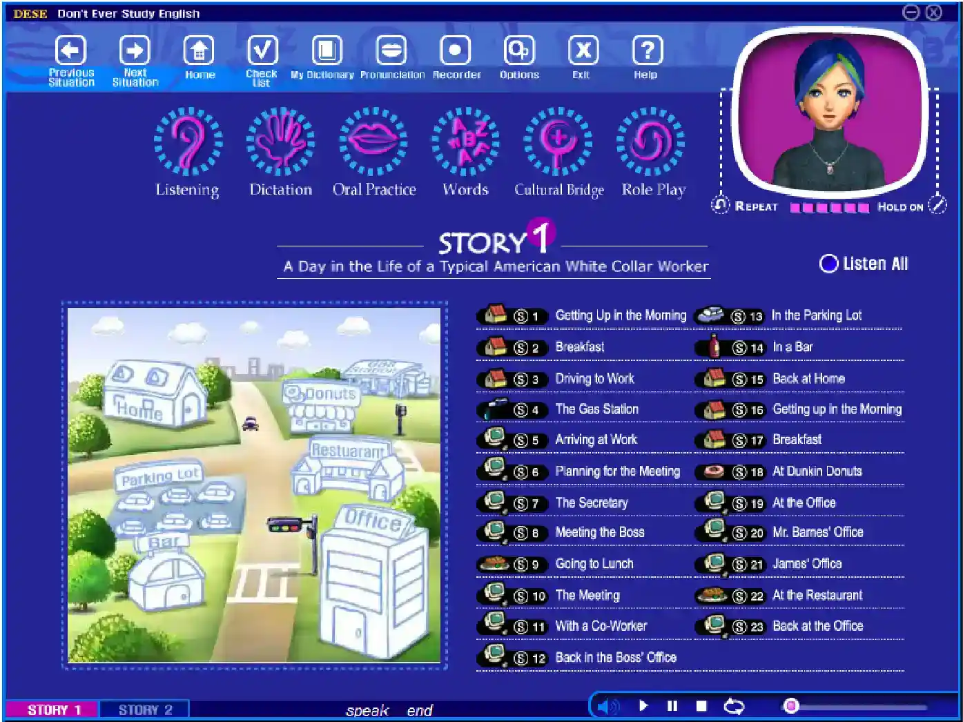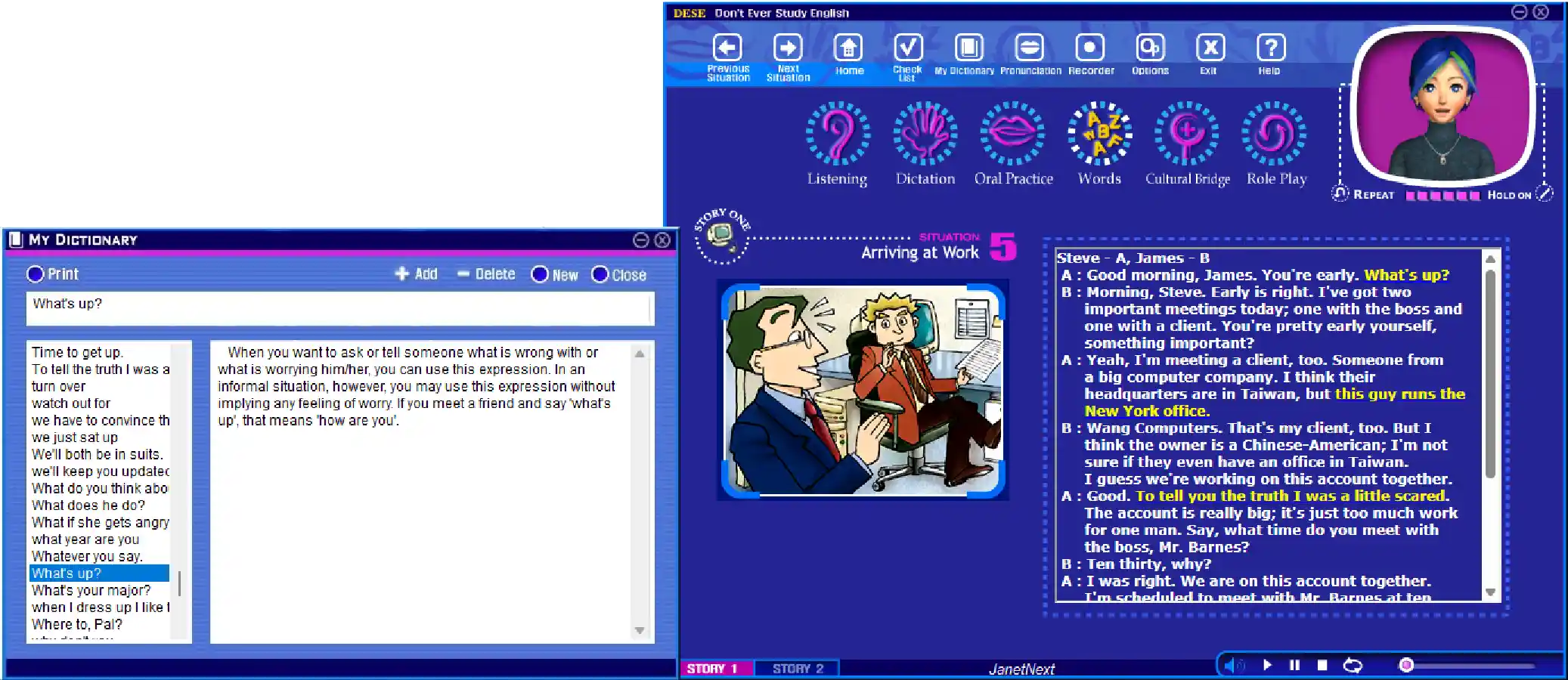 『英語は勉強しないで』には日本語の補助は一切入っていません。メニュー表示から、会話文、辞書、説明文、学習の進行をナビゲートするサイバーティーチャー‟ジャネット”の指示語など、そのすべてが英語です。